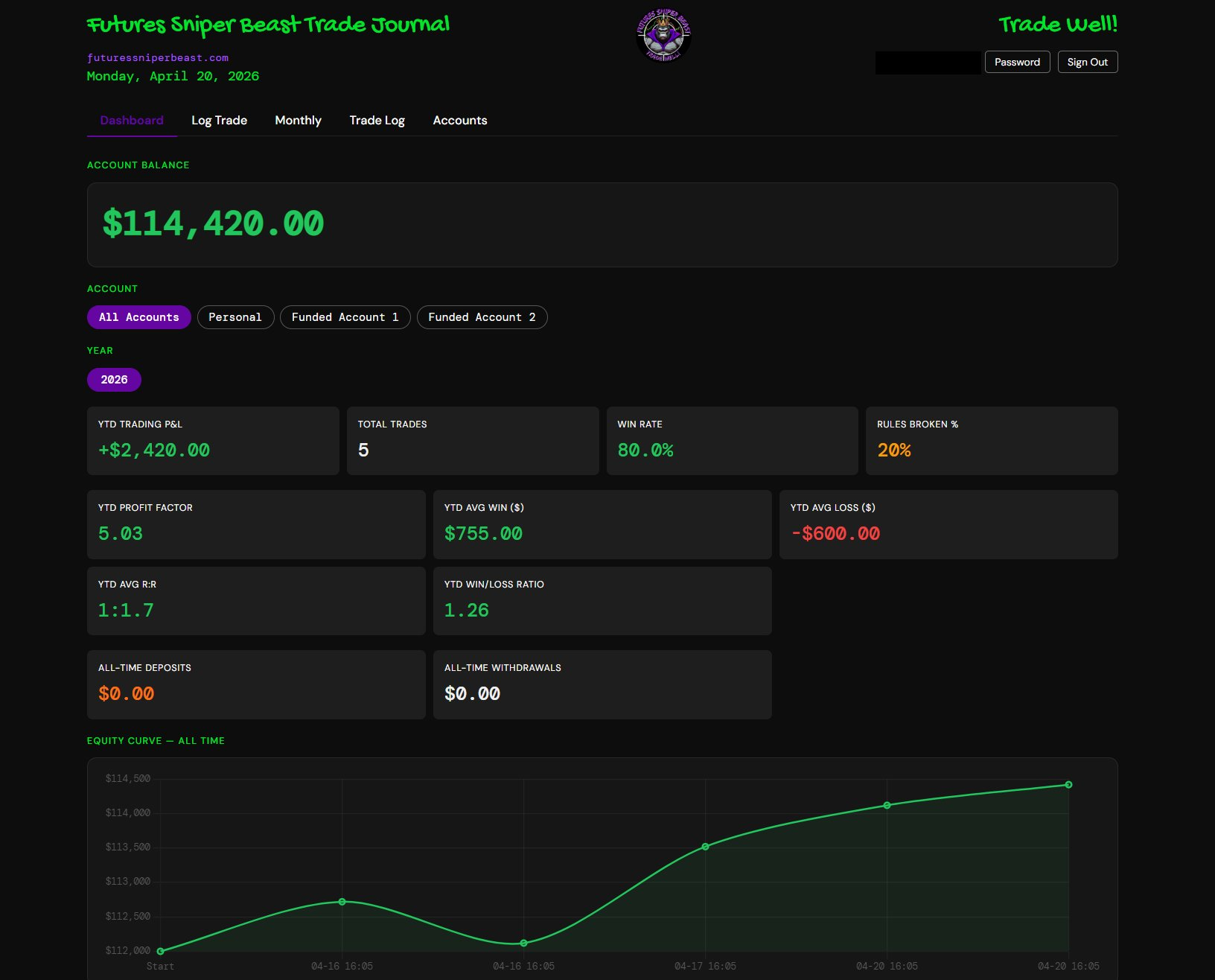 Track every trade like a sniper. Cloud-synced, multi-account, built specifically for futures traders. Instant access after purchase.
